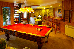 After a day of hiking or skiing, relax in your private indoor custom Jacuzzi opening into a recreation room which boasts a pool table, wood-burning fireplace sitting area, wet bar, and multi-purpose game table.